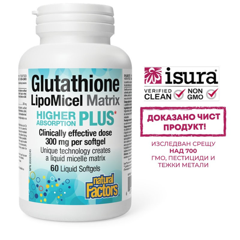 Продуктът Glutathione LipoMicel Matrix на Natural Factors съдържа високоусвоим глутатион за защита от оксидативното увреждане, причинено от свободните радикали и забавяне процесите на стареене.