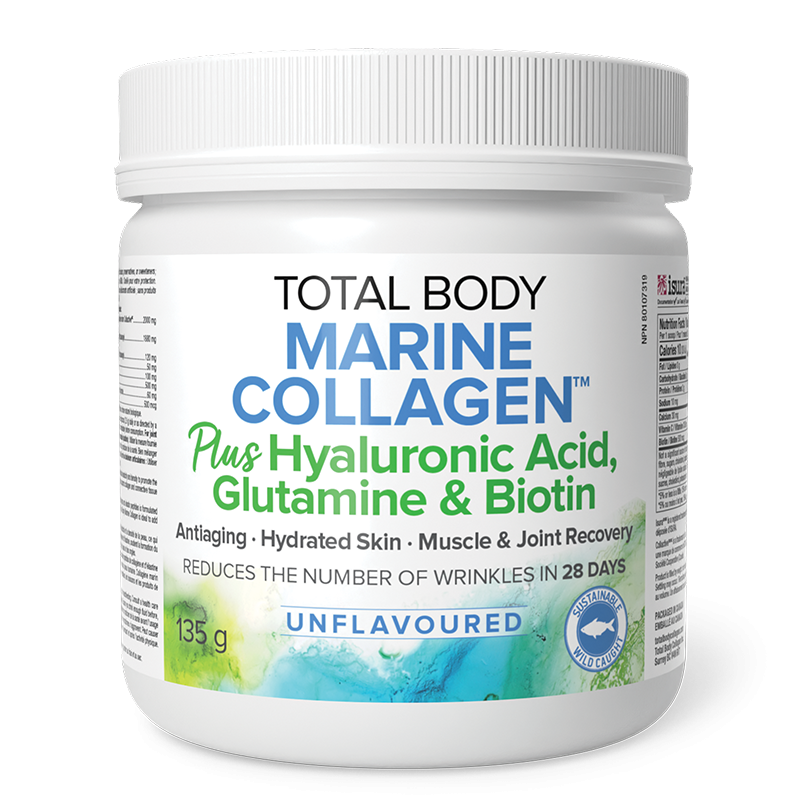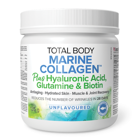 Колагенът е най-разпространеният протеин в човешкото тяло. Той е основен градивен елемент на кожата, ставите, сухожилията, мускулите, костите и кръвоносните съдове и играе жизненоважна роля за поддържането на структурната цялост на организма. За съжаление с всяка изминала година тялото произвежда с около 1% по-малко колаген, а поради особеностите на хранителния режим в развитите страни приемът му прогресивно намалява. Хранителната добавка Total Body Marine Collagen™ с добавени хиалуронова киселина, глутамин и биотин на марката Natural Factors е предназначена да компенсира този дефицит, за да съдейства за забавяне на стареенето и поддържане на здравето на кожата, костите и мускулите.