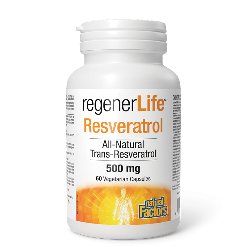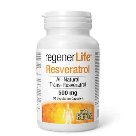 Regener Life Resveratrol предлага силно концентрирана форма на изцяло натурален транс-ресвератрол, мощен антиоксидант за защита на клетките и тъканите от оксидативно увреждане, което причинява преждевременно стареене. Ресвератролът помага за защитата на кръвоносните съдове, мозъчните клетки, ставната тъкан и кожата. Той е ефективна формула за здраве и дълголетие на цялото тяло. Продуктът е извлечен от грозде, отглеждано в долината Оканаган в Британска Колумбия и японска акация. Ресвератрол е част от линията добавки против стареене Regener Life, специално създадена за подмладяване и дълголетие на цялото тяло. Той осигурява 250 mg чист, силен, изцяло натурален транс-ресвератрол във всяка вегетарианска капсула.