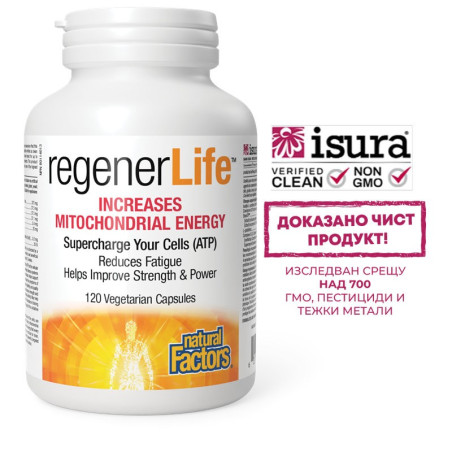 Rеgener Life™ Increases Mitochondrial Energy е формула с мощни хранителни съединения, за които е доказано, че оптимизират митохондриалната функция и антиоксидантната защита. Митохондриите са микроскопичните органели, намиращи се в повечето от човешките клетки, които са жизненоважни за клетъчното дишане и производството на енергия. Капсулите помагат за намаляване на симптомите на умора и допринасят за здравето на мозъка, мускулите и сърцето. Increases Mitochondrial Energy помага за намаляване на симптомите на стрес, като болка, умора, безсъние, раздразнителност и намалено качество на живот. Тази вегетарианска формула е чудесен избор за здравето на възрастни хора с намалена митохондриалната функция, за хора, изложени на действието на токсини и за всички, които искат да подобрят силата и издръжливостта си при интензивна физическа активност.