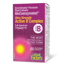 Продуктът Active B Complex BioCoenzymated™ на Natural Factors съдържа комплекс от всички витамини на група В, представени в техните биоактивни форми, които не се нуждаят от преобразуване в организма и бързо компенсират дефицита. Витамин В комплексът на Natural Factors е с най-висока степен на абсорбция и постига отлична бионаличност и максимално разпределение в клетките и тъканите. Ефектът му е подсилен от двата витаминоподобни нутриента холин и инозитол, както и от специални плодови, зеленчукови, билкови и водораслови екстракти.