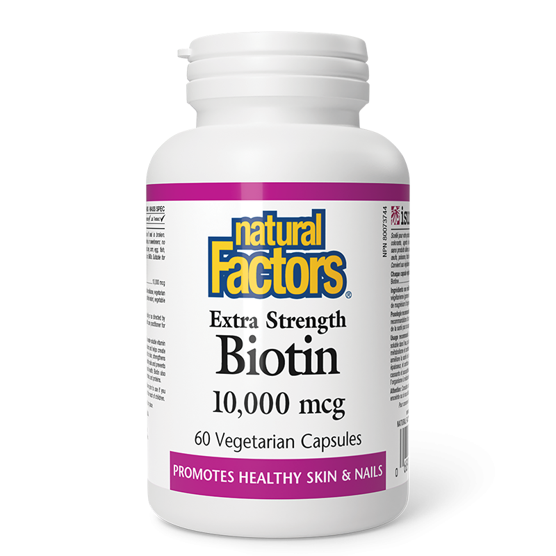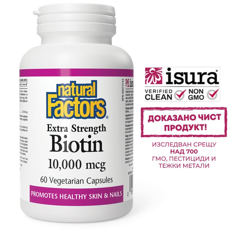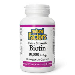 Biotin Extra Strength от Natural Factors осигурява висока доза биотин, който съдейства за нормалното разграждане и усвояване на мазнини, въглехидрати и протеини и подкрепя здравословното състояние на косата, кожата и ноктите.