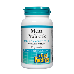 Мега пробиотик на Natural Factors осигурява 12 милиарда активни пробиотични клетки от 4 щама във всяка доза. Формулата предоставя сигурна и напълно естествена подкрепа за поддържане и възстановяване на чревната и вагинална микрофлора. Мега пробиотик подобрява усвояването на хранителните вещества от храната, редуцира чревни неразположения като диария и запек, включително и при лактозна чувствителност. Този пробиотик притежава мощен ефект за противодействие на хранителни патогени, причинители на бактериалните инфекции салмонелоза, листериоза и заболявания, причинени от ешерихия коли.