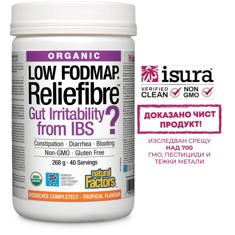 Reliefibre™ е сертифициран, клинично признат low-FODMAP продукт. Съдържа силно разтворими, органик диетични фибри, подходящи за хора със синдром на раздразненото дебело черво.