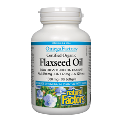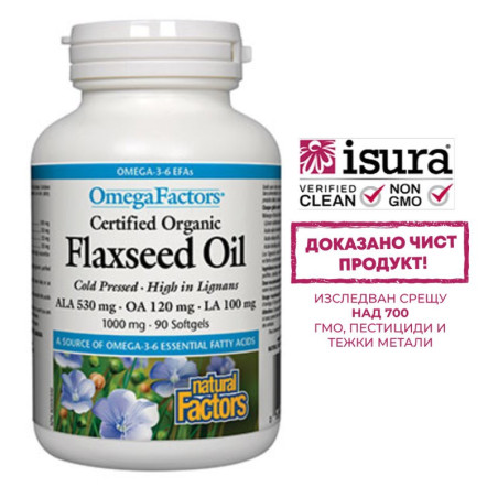 Оригинален канадски продукт на Natural Factors. С високо съдържание на омега-3 мастни киселини. Извлечено от органичен сертифициран канадски лен, който се отглежда в Канада. С добавен витамин Е срещу окисляване на маслото!