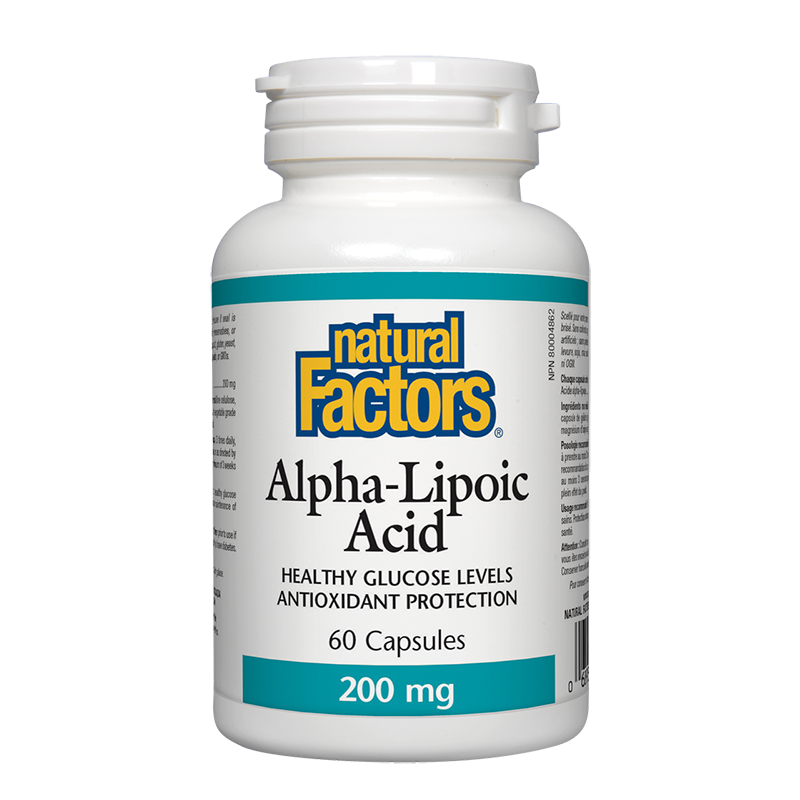 Алфа-липоева киселина на канадската компания Natural Factors, подобрява глюкозния обмен и е особено препоръчителна в случаите на преддиабетно състояние, диабет, затлъстяване и наднормено тегло. Поддържа нормалното състояние на периферните нерви и зрението.